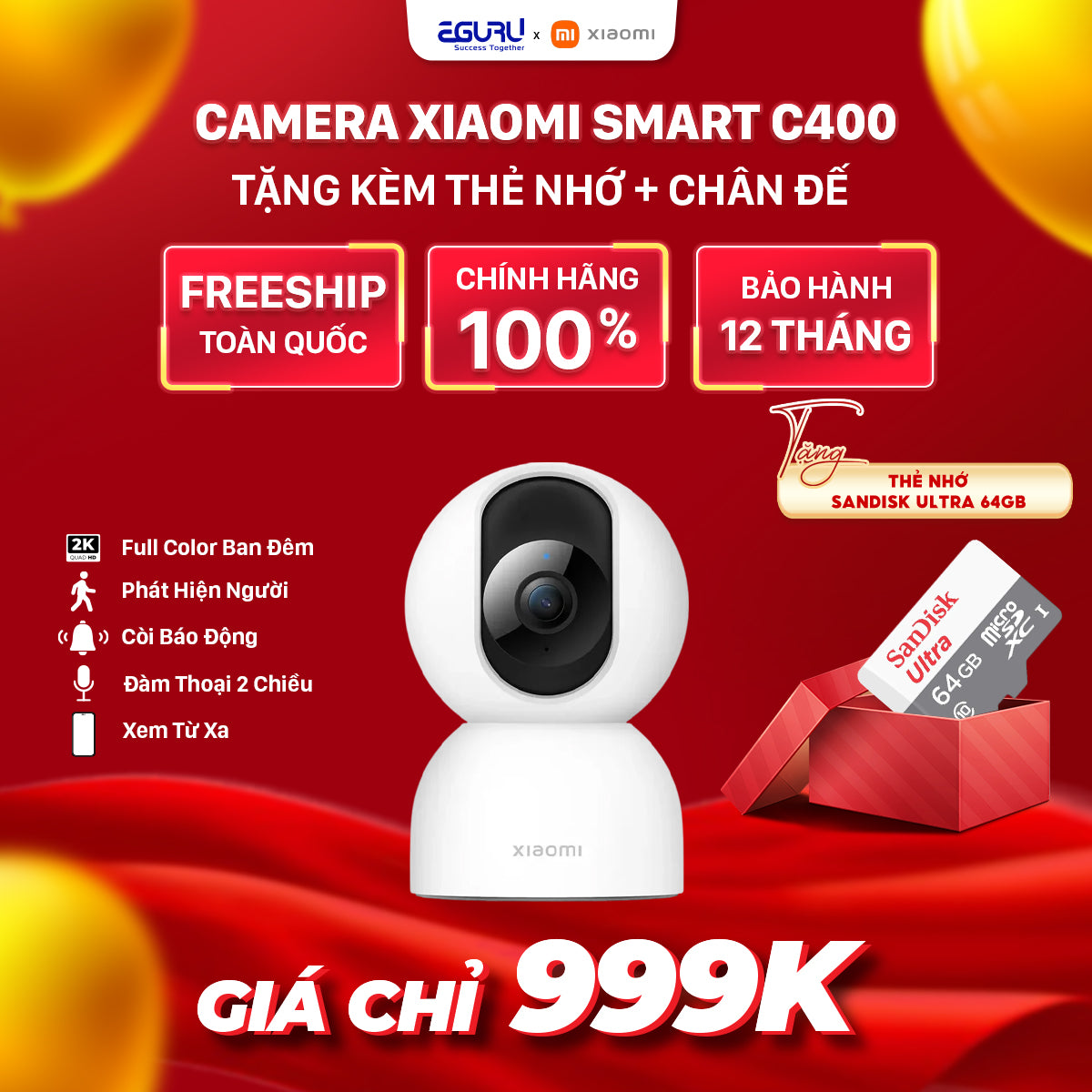 Combo CAMERA IP Wifi 360 4MP Xiaomi Smart Camera C400(BHR6619GL) + Thẻ nhớ SanDisk 64G + Chân đế gắn tường