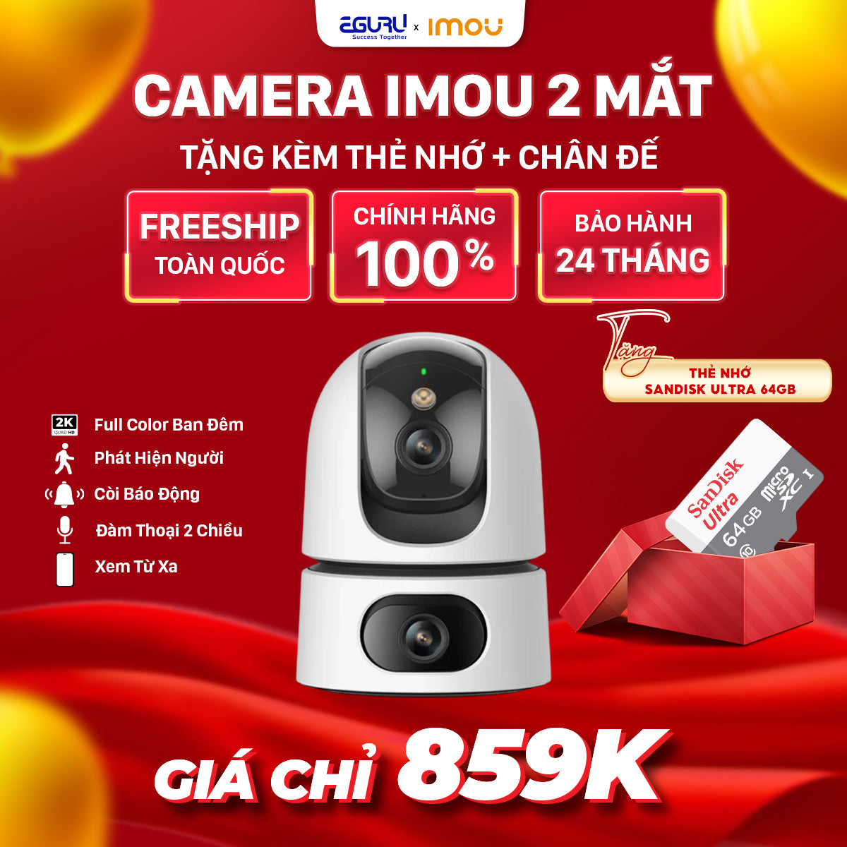 Combo Camera IMOU 2 Mắt 360 5MP IPC-S2XP-10M0WED + Thẻ nhớ SanDisk Ultra 64GB + Chân đế gắn tường
