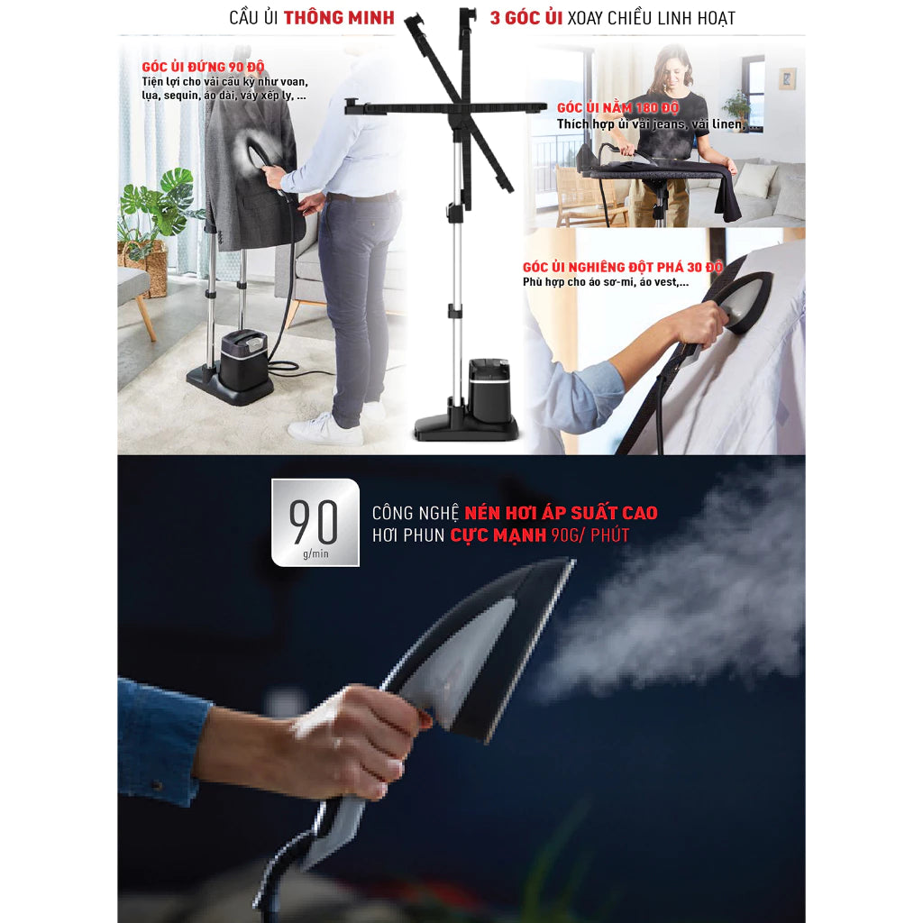 • Cầu ủi đi kèm có thể điều chỉnh được ở 3 vị trí (nghiêng 45 độ, ngang 180 độ, đứng 90 độ)