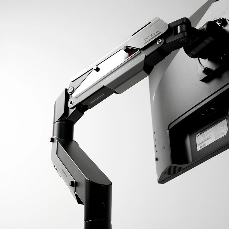 T9 Pro III sử dụng cơ chế Fluid Arc với vòng bi xoay mượt, đảm bảo di chuyển ổn định ngay cả khi gắn màn hình nặng. Khả năng lật màn từ +70° đến -45°, xoay ngang ±90°, và xoay trục 360° giúp người dùng dễ dàng điều chỉnh tư thế làm việc lý tưởng. Tùy chọn khóa góc xoay ±90° hỗ trợ bảo vệ màn hình khi kê sát tường hoặc trong không gian chật hẹp.