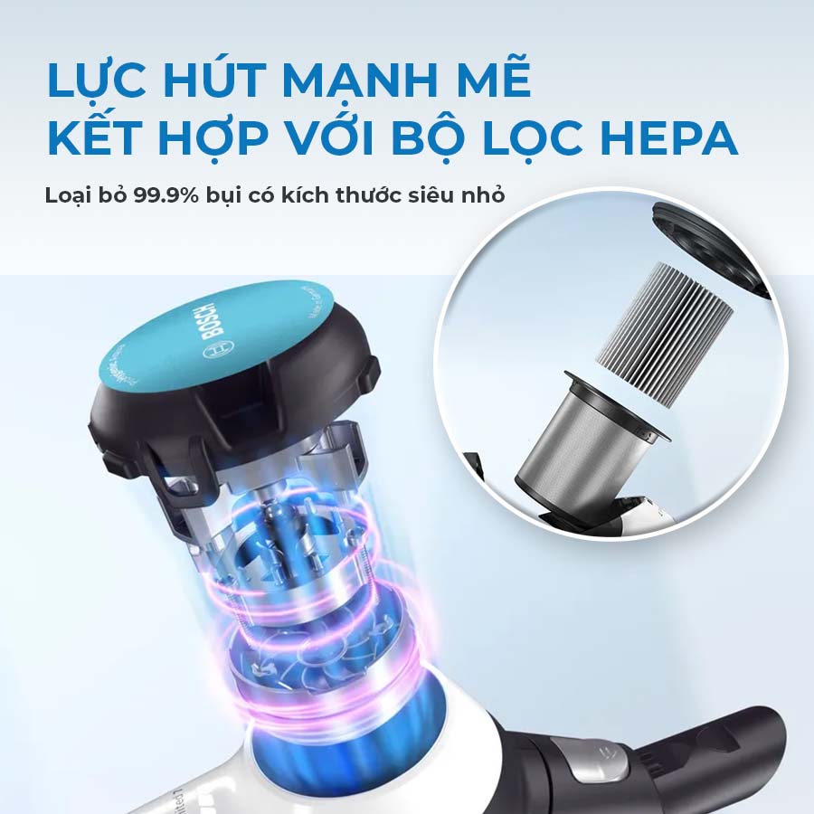 Bosch BCS71HYG3 là giải pháp làm sạch an toàn với chức năng hút bụi và lau nhà kết hợp cùng hệ thống lọc HEPA giúp loại bỏ hiệu quả các loại bụi bẩn khi chúng đi vào máy nhằm mang lại không khí trong lành hơn.