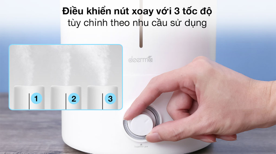 Bảng điều khiển nút xoay với 3 tốc độ phun tạo ẩm dễ dùng, tùy chỉnh theo nhu cầu, thời điểm sử dụng thiết bị