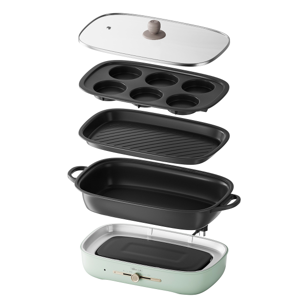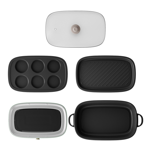 - Bộ sản phẩm bao gồm: 1 Đế điện + 1 Lòng nồi lẩu (5L) + 1 Khay nướng + 1 Nắp kính